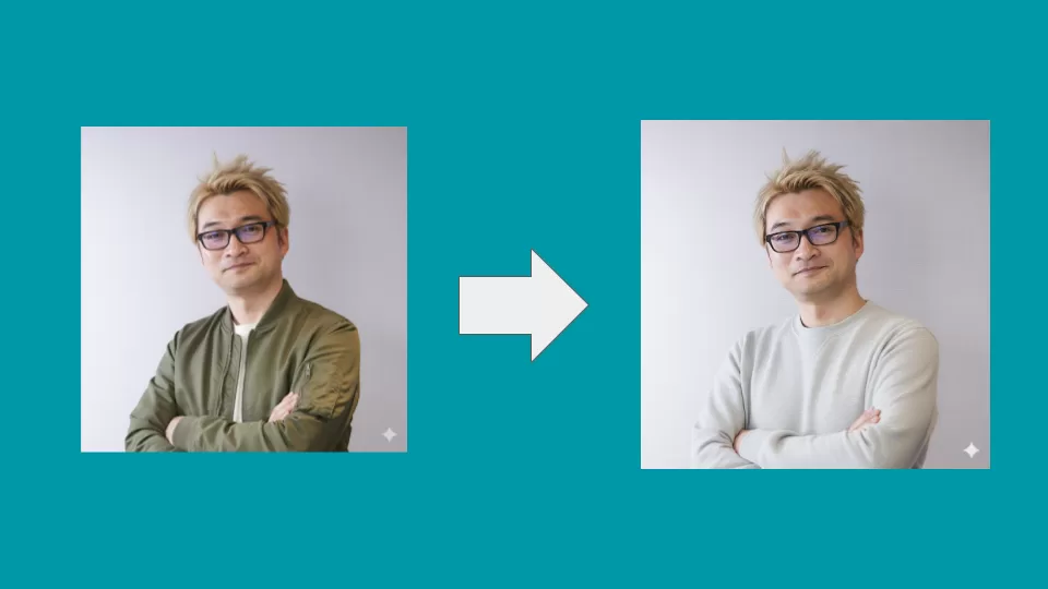 次に「ジャケットを脱いでトレーナーを着せて」と指示をだしました。今の時代「トレーナー」とはいわず「スウェット」という表現がいいのでしょうが、あえて「トレーナー」として指示をだしました。