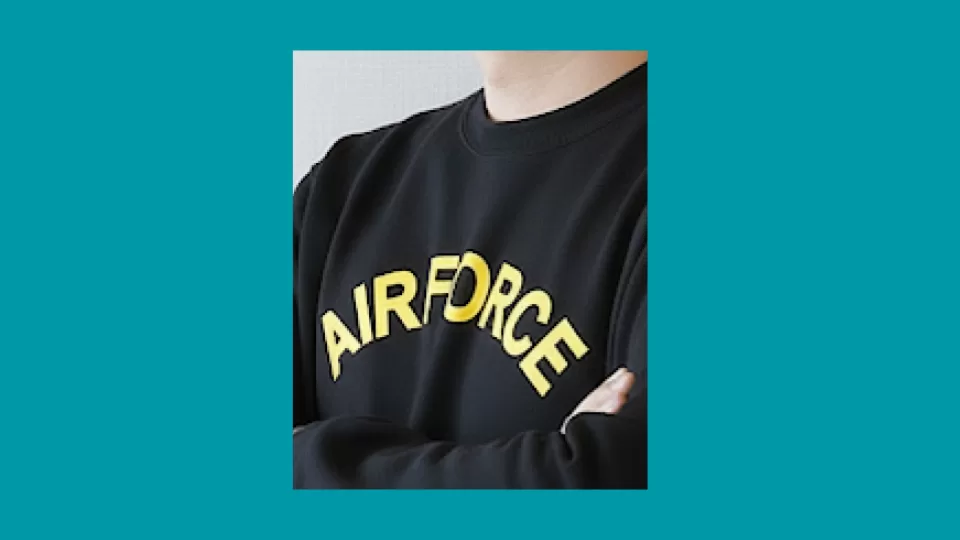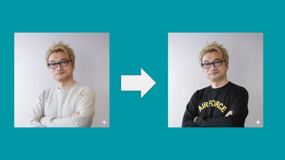 続けて服を着替えさせてみましょう。試しにGoogleにて「トレーナー US」で画像検索をして気になった画像を拝借し、Geminiにアップロード。そして「このトレーナーの雰囲気で生地を黒、文字を黄色にして」と指示を出しました(プロンプトを書きました)。