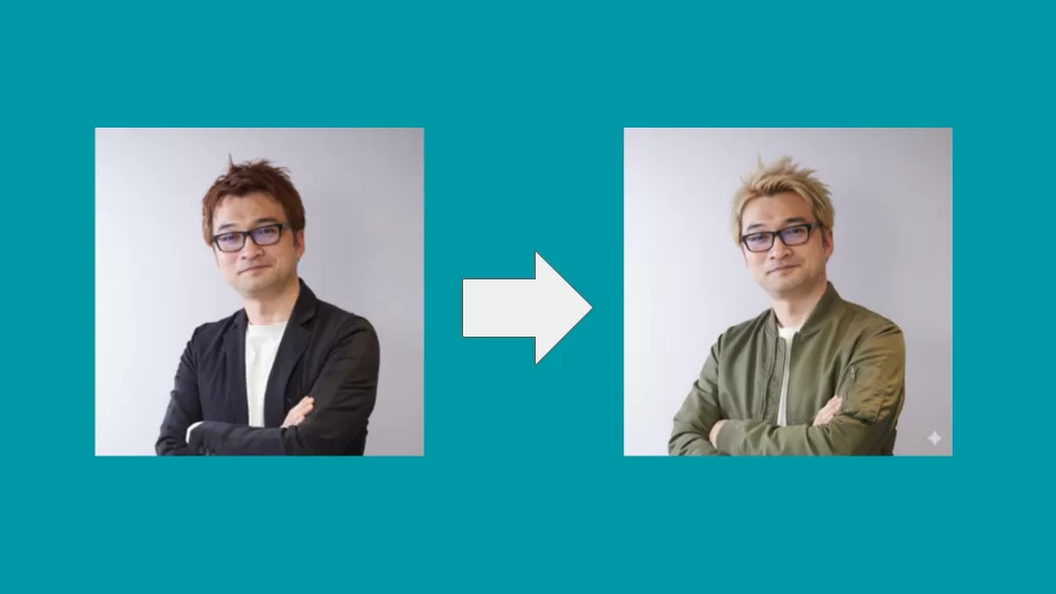 さて、どんなことができるのか・・ですが、このサイトでも使っていますが私のプロフィール画像を使って遊んでみます。早速ではありますが、画像をアップロードして、「金髪にしてMA-1を着せて」と指示を出しました。