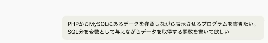 仕事の内容なので詳細は語ることができませんが、方向性としてはPHPとMySQLを使ったウェブシステムです。データベースからデータを取得したり、データをデータベースに書き込んだり・・の代物です。数年前に実際に自分で色々と調べながら書いたことはあるのですが、だいぶ開発から離れていたこともあるので、具体的なSQL構文の書き方とかPHPの関数のあり方とかをすっかり忘れていたことと、プログラムを書いていた方ならなんとなくわかると思いますが、指が覚えていなかったのでバイブコーディングにトライしてみたという感じです。